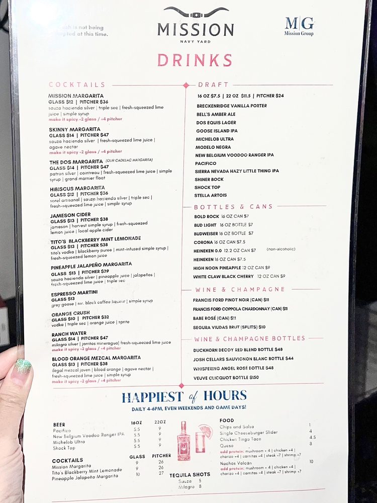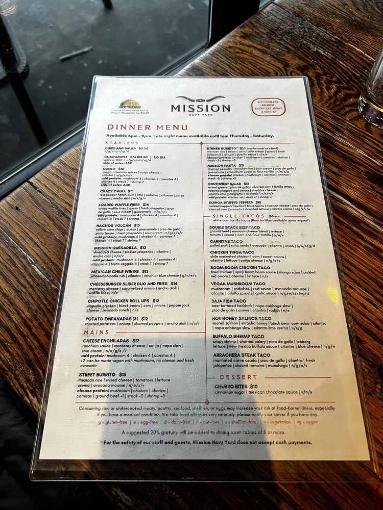 Mission Navy Yard is a Tex-Mex bar offering a trendy and vibrant atmosphere, perfect for dinner or late-night dining. With a variety of options including vegan and vegetarian dishes, the menu features delicious single tacos like the Arrachera Steak Taco and Baja Fish Taco. Starters like the Beef Birria Tacos and Boom Boom Chicken Bites are great for sharing. For mains, the Cheese Enchiladas and Mission Fajita are must-try dishes. The Quinoa Stuffed Peppers are a unique and flavorful option for those looking for something different. With accessible parking, wheelchair accessibility, and outdoor seating, Mission Navy Yard is a great spot for groups and families alike. The diverse menu and welcoming atmosphere make it a standout choice in the Navy Yard area.